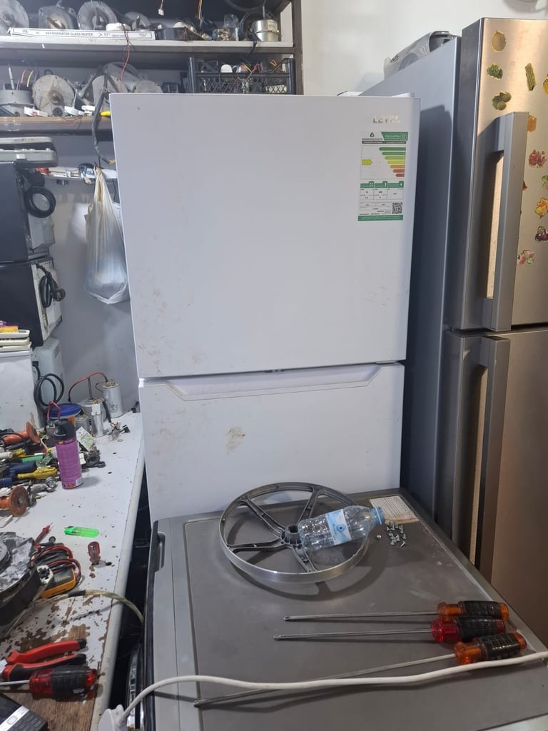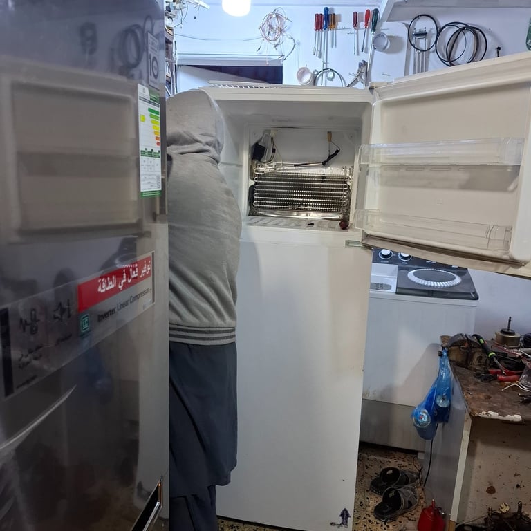 فنيون متخصصون يصلحون أعطال الثلاجات بسرعة وفعالية.